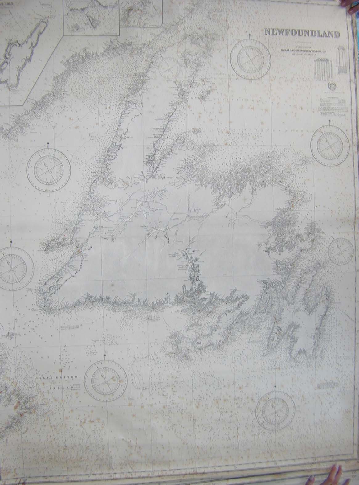 | Descripcion | Las cartas náuticas son mapas de las aguas navegables con indicaciones de la latitud, longitud, profundidad del fondo e indicaciones de zonas con riesgos como zonas de escasa profundidad como bancos de arena o rocas, acantilados… así como puertos o faros. Hay cartas náuticas que abarcan mucho territorio y están pensadas para una navegación más genérica y otras que recogen zonas muy concretas que están destinadas para facilitar la navegación más en detalle. Esta carta náutica recoge las costas de la isla de Terranova, frente a la costa oriental de Canadá, así como parte de la desembocadura del rio y golfo de San Lorenzo. |