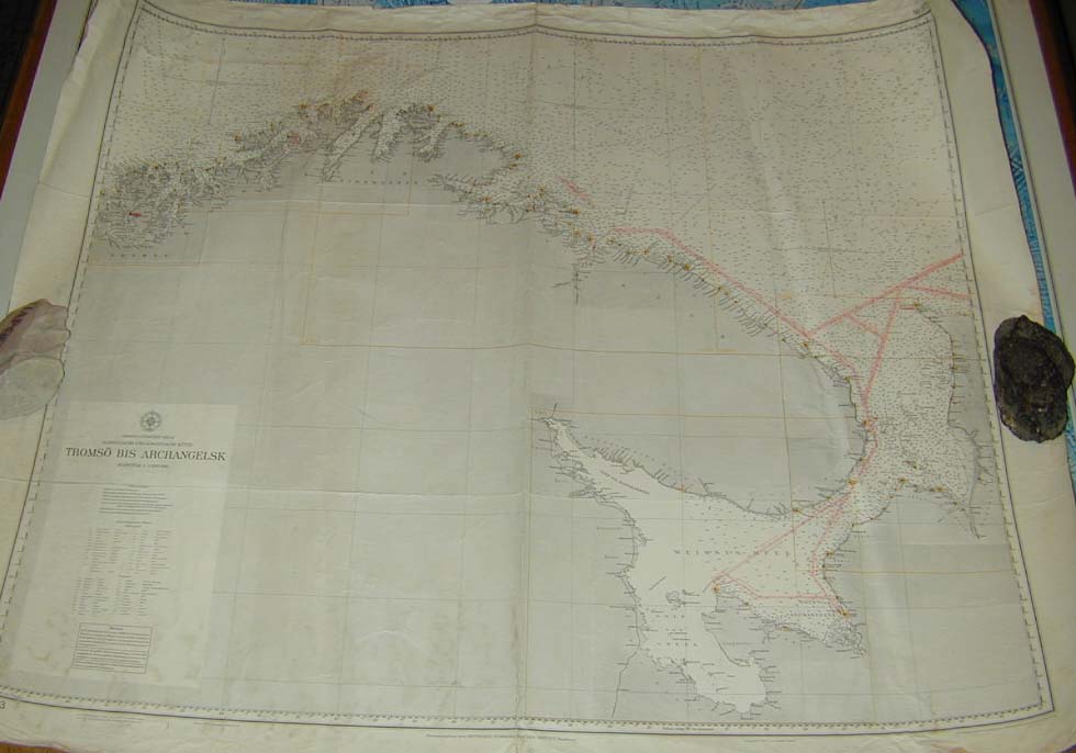 | Deskribapena | Las cartas náuticas son mapas de las aguas navegables con indicaciones de la latitud, longitud, profundidad del fondo e indicaciones de zonas con riesgos como zonas de escasa profundidad como bancos de arena o rocas, acantilados… así como puertos o faros. Hay cartas náuticas que abarcan mucho territorio y están pensadas para una navegación más genérica y otras que recogen zonas muy concretas que están destinadas para facilitar la navegación más en detalle. Esta carta náutica recoge el norte de la costa de Noruega y de Rusia, y más concretamente la costa que va desde la ciudad noruega de Tromso hasta la ciudad rusa de Arcángel situada en el Mar Blanco. |