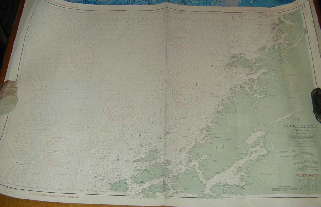 | Deskribapena | Las cartas náuticas son mapas de las aguas navegables con indicaciones de la latitud, longitud, profundidad del fondo e indicaciones de zonas con riesgos como zonas de escasa profundidad como bancos de arena o rocas, acantilados… así como puertos o faros. Hay cartas náuticas que abarcan mucho territorio y están pensadas para una navegación más genérica y otras que recogen zonas muy concretas que están destinadas para facilitar la navegación más en detalle. Esta carta náutica recoge parte de la costa de Noruega, concretamente la comprendida desde la isla Smola a la isla Vega, incluyendo el fiordo de Trondheim. |