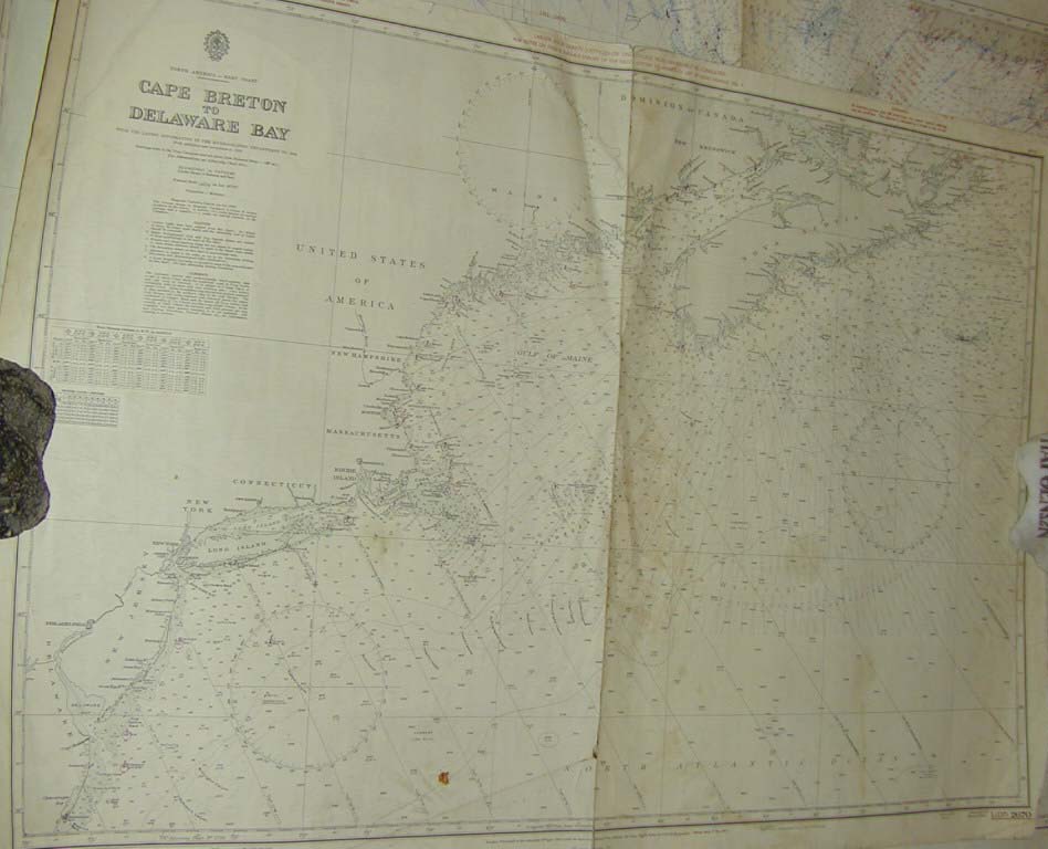 | Deskribapena | El sistema de navegación Decca era un sistema de navegación surgido en la década de 1940 basado en determinar la posición a partir de señales de radio enviadas desde repetidores en tierra y receptores a bordo de buques. Esas señales recibidas eran trasladadas a estas cartas náuticas Decca en donde aparecen una serie de curvas con las frecuencias de las señales. Este sistema tenía una precisión de 200 metros a la redonda. Esta carta náutica Decca recoge la costa que va desde la isla de Cabo Breton en la región de Nueva Escocia en Canadá hasta la Bahía de Delaware en Estados Unidos. |