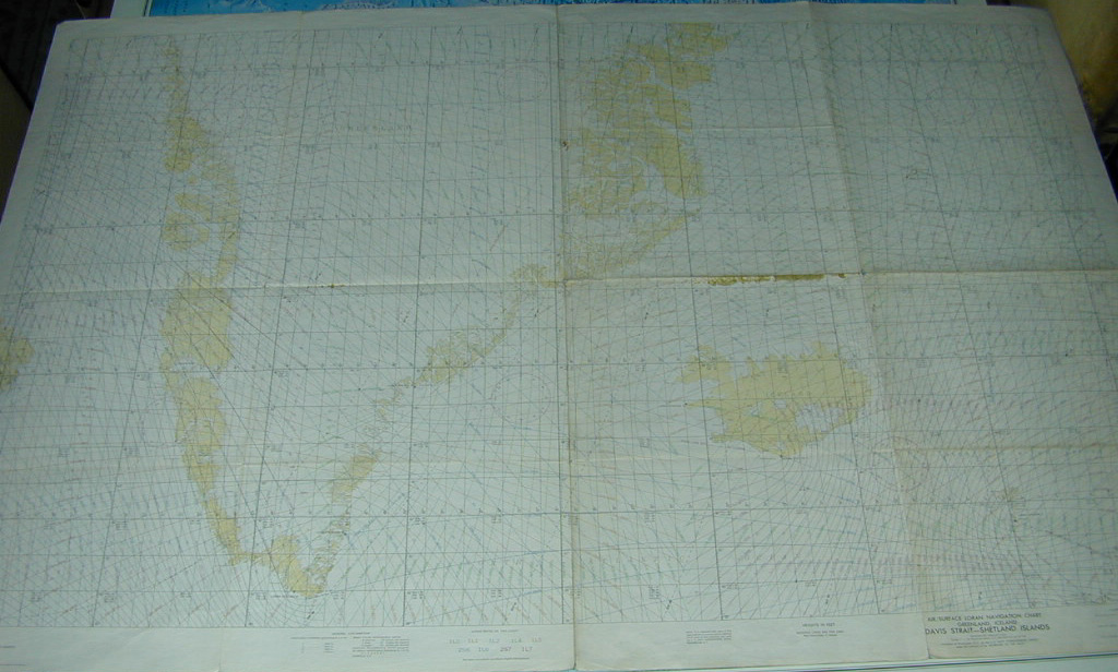 | Deskribapena | El sistema de navegación Decca era un sistema de navegación surgido en la década de 1940 basado en determinar la posición a partir de señales de radio enviadas desde repetidores en tierra y receptores a bordo de buques. Esas señales recibidas eran trasladadas a estas cartas náuticas Decca en donde aparecen una serie de curvas con las frecuencias de las señales. Este sistema tenía una precisión de 200 metros a la redonda. Esta carta náutica Decca recoge una amplia franja marítima que abarca el Estrecho de Davis, situado entre la isla canadiense de Baffin y Groenlandia, la costa sur de Groenlandia, Islandia y los archipiélagos de las Islas Feroe y las Islas Shetland. |