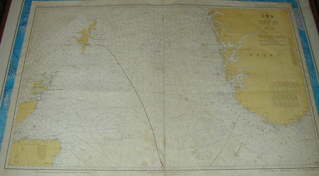 | Deskribapena | El sistema de navegación Decca era un sistema de navegación surgido en la década de 1940 basado en determinar la posición a partir de señales de radio enviadas desde repetidores en tierra y receptores a bordo de buques. Esas señales recibidas eran trasladadas a estas cartas náuticas Decca en donde aparecen una serie de curvas con las frecuencias de las señales. Este sistema tenía una precisión de 200 metros a la redonda. Esta carta náutica Decca recoge el Mar del Norte, abarcando parte de la costa noreste de Escocia, los archipiélagos de las Islas Orcadas y las Islas Shetland y parte de la costa oeste meridional de Noruega. |
