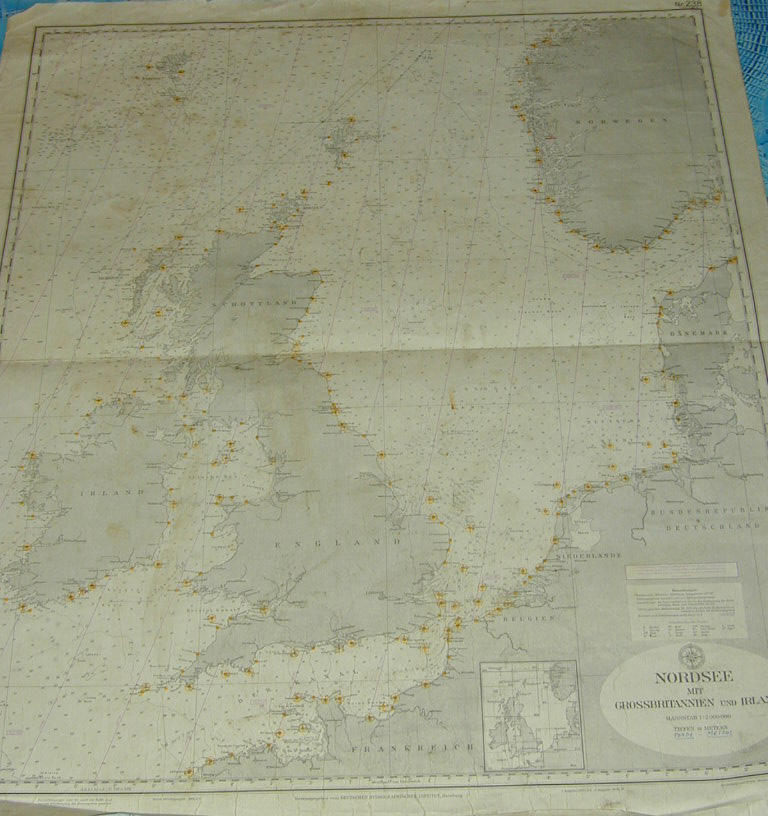 | Deskribapena | Las cartas náuticas son mapas de las aguas navegables con indicaciones de la latitud, longitud, profundidad del fondo e indicaciones de zonas con riesgos como zonas de escasa profundidad como bancos de arena o rocas, acantilados… así como puertos o faros. Hay cartas náuticas que abarcan mucho territorio y están pensadas para una navegación más genérica y otras que recogen zonas muy concretas que están destinadas para facilitar la navegación más en detalle. Esta carta náutica recoge las costas que abarca el Canal de la Mancha y Mar del Norte, lo que comprende a Irlanda, Gran Bretaña, Francia, Bélgica, Países Bajos, Alemania, Dinamarca y Noruega. Esta carta perteneció al buque pesquero “Monte Aralar”. |