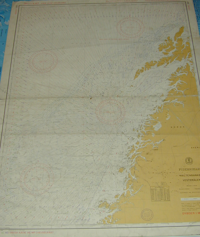 | Deskribapena | El sistema de navegación Decca era un sistema de navegación surgido en la década de 1940 basado en determinar la posición a partir de señales de radio enviadas desde repetidores en tierra y receptores a bordo de buques. Esas señales recibidas eran trasladadas a estas cartas náuticas Decca en donde aparecen una serie de curvas con las frecuencias de las señales. Este sistema tenía una precisión de 200 metros a la redonda. Esta carta náutica Decca recoge la costa noroeste de Noruega, abarcando desde las Islas Lofoten hasta Namsos. |