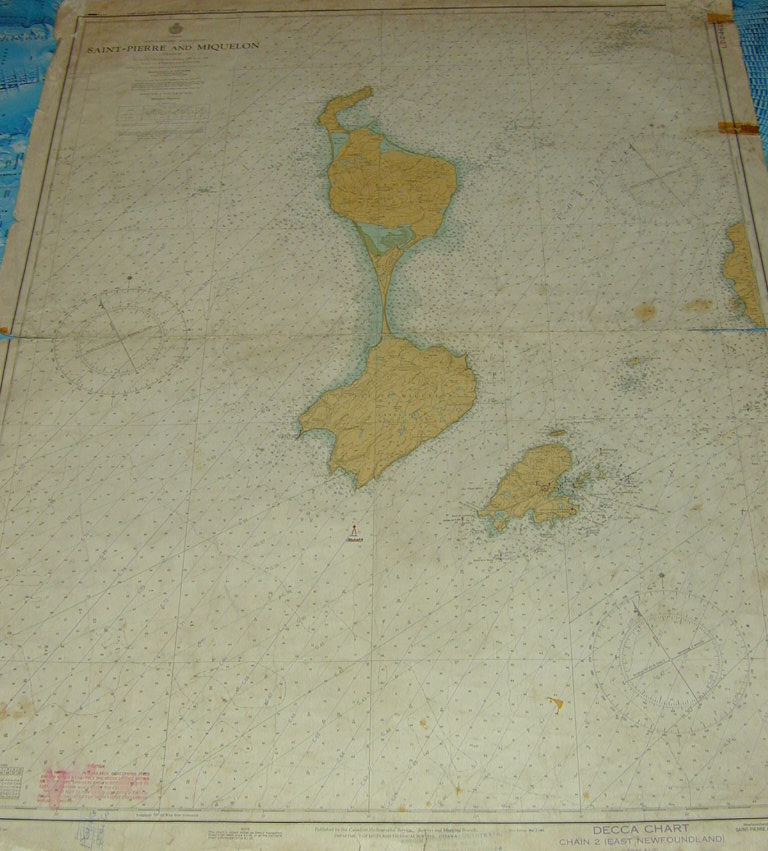 | Deskribapena | El sistema de navegación Decca era un sistema de navegación surgido en la década de 1940 basado en determinar la posición a partir de señales de radio enviadas desde repetidores en tierra y receptores a bordo de buques. Esas señales recibidas eran trasladadas a estas cartas náuticas Decca en donde aparecen una serie de curvas con las frecuencias de las señales. Este sistema tenía una precisión de 200 metros a la redonda. Esta carta náutica Decca recoge la costa de las islas francesas de San Pedro y Miquelón, situadas frente a las costas de Canadá. |