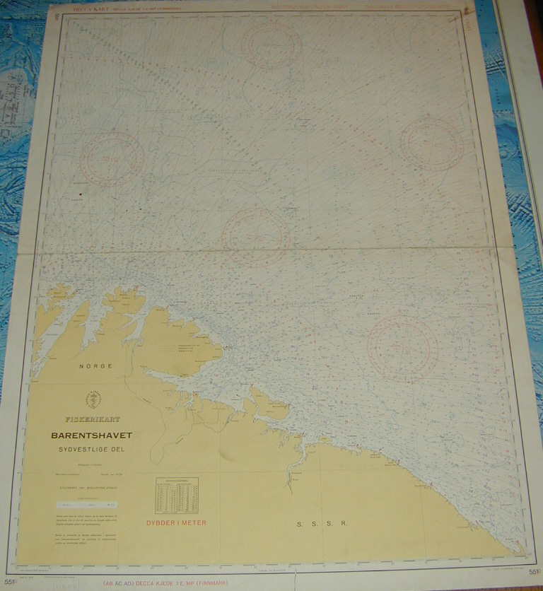 | Deskribapena | El sistema de navegación Decca era un sistema de navegación surgido en la década de 1940 basado en determinar la posición a partir de señales de radio enviadas desde repetidores en tierra y receptores a bordo de buques. Esas señales recibidas eran trasladadas a estas cartas náuticas Decca en donde aparecen una serie de curvas con las frecuencias de las señales. Este sistema tenía una precisión de 200 metros a la redonda. Esta carta náutica Decca recoge el Mar de Barents, concretamente parte de la costa norte de Noruega y Rusia, y más concretamente desde el fiordo noruego de Porsangen hasta la ciudad rusa de Ostrovnoy. |