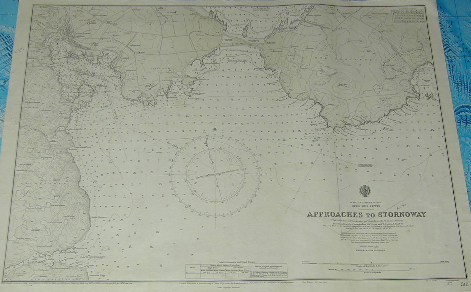 | Deskribapena | Las cartas náuticas son mapas de las aguas navegables con indicaciones de la latitud, longitud, profundidad del fondo e indicaciones de zonas con riesgos como zonas de escasa profundidad como bancos de arena o rocas, acantilados… así como puertos o faros. Hay cartas náuticas que abarcan mucho territorio y están pensadas para una navegación más genérica y otras que recogen zonas muy concretas que están destinadas para facilitar la navegación más en detalle. Esta carta náutica recoge la costa que da paso al puerto de Stornoway ubicado en la parte sur de la isla de Lewis en la Hébridas Exteriores, un archipiélago escoces situado al noroeste de Gran Bretaña. |