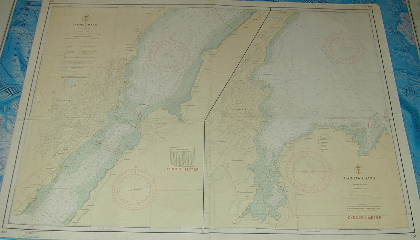 | Deskribapena | Las cartas náuticas son mapas de las aguas navegables con indicaciones de la latitud, longitud, profundidad del fondo e indicaciones de zonas con riesgos como zonas de escasa profundidad como bancos de arena o rocas, acantilados… así como puertos o faros. Hay cartas náuticas que abarcan mucho territorio y están pensadas para una navegación más genérica y otras que recogen zonas muy concretas que están destinadas para facilitar la navegación más en detalle. Esta carta náutica recoge dos puertos noruegos distantes entre sí. En una de las mitades aparece la bahía y puerto de Tromso, mientras que en la otra mitad aparece los de Harstad. |