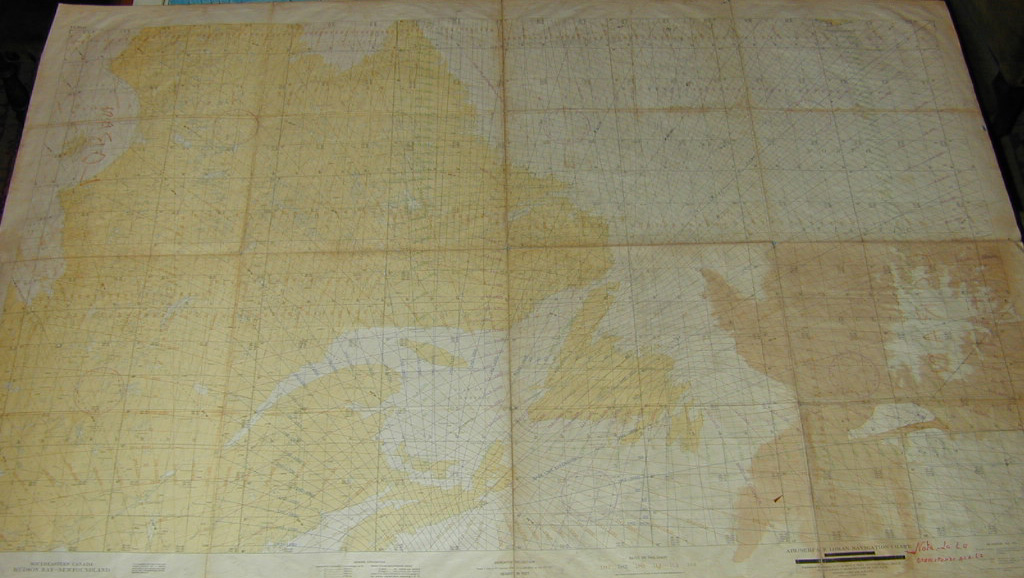 | Deskribapena | El sistema de navegación Loran C era un sistema de navegación surgido en 1974 basado en determinar la posición a partir de señales de radio enviadas desde repetidores en tierra y receptores a bordo de buques. Esas señales recibidas eran trasladadas a estas cartas náuticas Loran C en donde aparecen una serie de curvas con las frecuencias de las señales. Este sistema tenía una precisión de 180 metros a la redonda. Esta carta náutica recoge la costa noreste de Canadá, abarcando desde la bahía de Hudson hasta Nueva Escocia. |