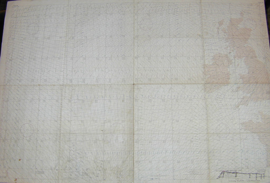 | Deskribapena | El sistema de navegación Loran C era un sistema de navegación surgido en 1974 basado en determinar la posición a partir de señales de radio enviadas desde repetidores en tierra y receptores a bordo de buques. Esas señales recibidas eran trasladadas a estas cartas náuticas Loran C en donde aparecen una serie de curvas con las frecuencias de las señales. Este sistema tenía una precisión de 180 metros a la redonda. Esta carta náutica recoge el Atlántico nororiental, abarcando las costas de Gran Bretaña, Irlanda y Francia. |