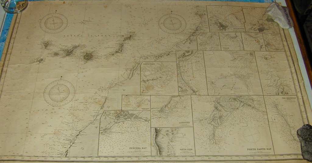 | Deskribapena | Las cartas náuticas son mapas de las aguas navegables con indicaciones de la latitud, longitud, profundidad del fondo e indicaciones de zonas con riesgos como zonas de escasa profundidad como bancos de arena o rocas, acantilados… así como puertos o faros. Hay cartas náuticas que abarcan mucho territorio y están pensadas para una navegación más genérica y otras que recogen zonas muy concretas que están destinadas para facilitar la navegación más en detalle. Esta carta náutica recoge las costas de las Islas Canarias y de Marruecos. En el espacio terrestre de Marruecos se han insertado las cartas náuticas de los principales puertos de las Islas Canarias, Azores, Madeira y Marruecos como por ejemplo Santa Cruz, Arrecife, Funchal, Porto Santo o Casablanca. |