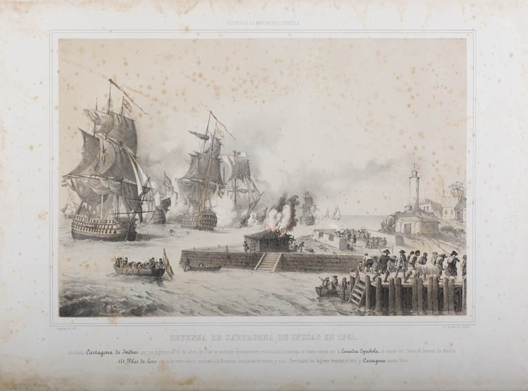 | Description | Litografía de Vicente Urrabieta y Ortiz en la cual se representa un combate naval en Cartagena de Indias. En 1741 Blas de Lezo consiguió derrotar a los ingleses y liberar a la ciudad, por lo que en la obra se observan varios navíos y parte de la ciudad con hombres defendiéndola. |
