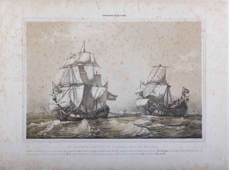 | Description | Representación de un buque español comandado por Blas de Lezo remolcando otro navío ingles capturado tras la batalla de 1710 en que rindió a 11 buques entre ellos el Stanhoppe. Grabado de José Vallejo y Galeazo, nacido en Málaga en el año 1821. Llegó a ser encargado de la Escuela de Artes y Oficios de Madrid y vocal de los jurados de las Exposiciones Nacionales de Bellas Artes en los años 1864 y 1866. |