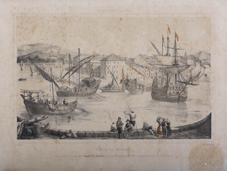 | Description | Grabado que representa la inspección de Isabel la Católica en el rio Nervión a su paso por Bilbao de parte de la armada que en 1481 se preparaba para apoyar al rey de Nápoles. Se aprecian varios navíos en el rio, tras los cuales aparece parte de la ciudad de Bilbao y en primer plano una serie de personajes. |