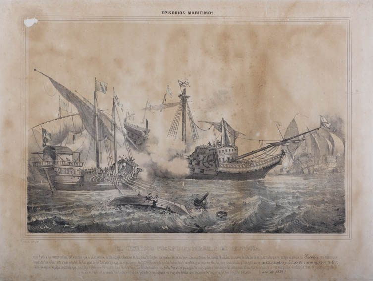 | Description | Representación de un combate naval en la que un galeón de la armada española que se dirigía al ataque de La Previsa en 1539 se separó de la flota y se encontró solo ante una flota turca. Este suceso lo protagonizó el almirante Machín de Munguía, quien mostro mucho valor y arrojo, por lo que pudieron salir victoriosos del combate. Se aprecian varias galeras turcas rodeando a un galeón español desarbolado. Grabado de Vicente Urrabieta Y Ortiz, quien en su momento fue considerado en España como uno de los ilustradores más efectivos del país. |