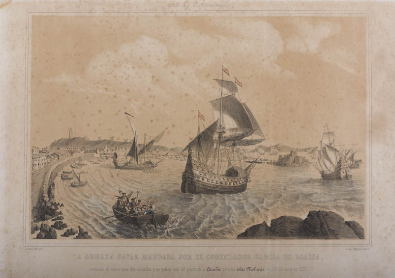 | Description | Grabado que representa la salida del Comendador Garcia de Loaisa hacia las Molucas, actuales Filipinas, desde el puerto de La Coruña el 24 de julio de 1525. Esta expedición, la primera destinada a tomar posesión de las Islas Filipinas para la Corona española fue encomendada por Carlos I de España a fray Garcia Jofre de Loaisa. En esta expedición le acompañaron Juan Sebastian de Elcano y un joven Andrés de Urdaneta, falleciendo a lo largo de la misma tanto Loaisa como Elcano.