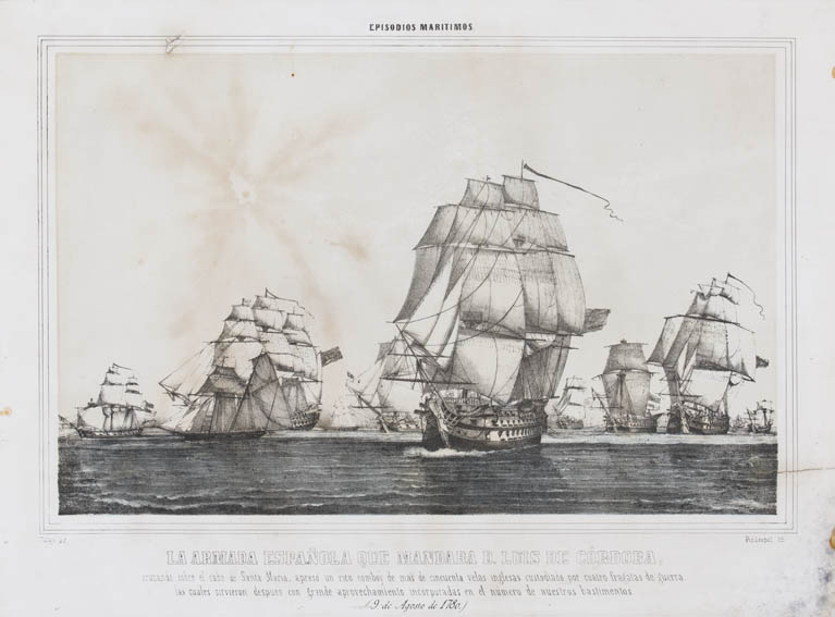 | Description | Representación de la captura de un convoy ingles por la escuadra de Luis de Córdoba en el cabo de Santa María el 9 de agosto de 1780. En la obra se observan varios navíos españoles e ingleses capturados y siendo remolcados. Luis de Córdoba fue un marino y militar español, 2º Capitán General de la Real Armada Española. |