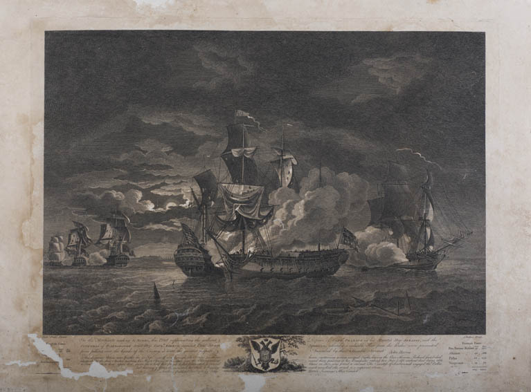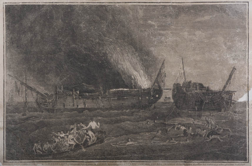 | Description | Grabado de Robert Dodd, marino británico y pintor famoso por su trabajo en el que muestra las guerras de coalición que se dieron antes de la Revolución francesa. En este caso tenemos una representación de un combate entre ingleses y estadounidenses en la costa británica el 23 de septiembre de 1779. En la obra se aprecian varios navíos luchando costado contra costado. |
