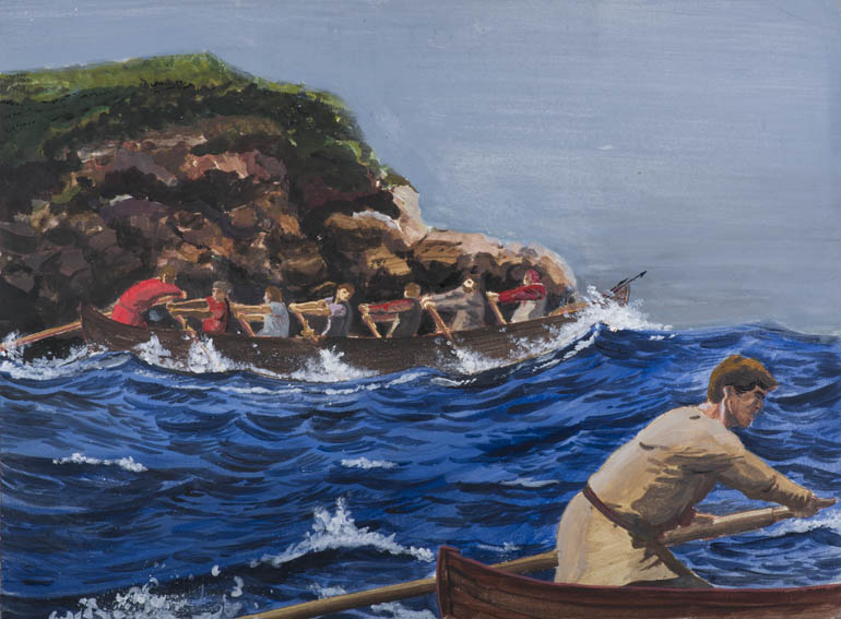 | Description | Acrílico del siglo XX que muestra una escena de caza de ballena en la que se aprecia en primer plano a un patrón de chalupa ballenera dirigiéndola. En segundo plano se ve a una chalupa ballenera navegando con toda su tripulación remando y como fondo tenemos un acantilado rocoso. Es del pintor Juan Luis Mendizabal, más conocido como “Mendi”. |