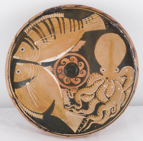 | Description | Plato de terracota realizado en el sur de Italia durante el periodo helenístico (350-300 a.C.). Figuras en color rojo decoran la pieza, las cuales representan animales marinos; una perca, una dorada y un pulpo con tentáculos enrollados. |