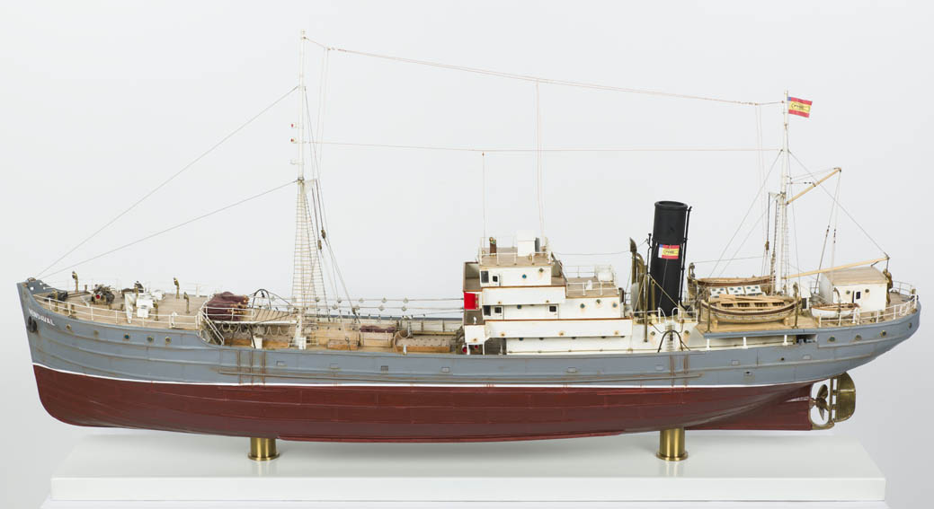 | Description | Modelo a escala del bacaladero "Vendaval" que fue construido en los astilleros Hall, Russell & Co., Ltd. en Aberdeen (Escocia). Fue botado el 27 de diciembre de 1927 por encargo de la empresa de Pasajes PYSBE. Fue especialmente diseñado y equipado para trabajar en los Grandes Bancos de Terranova (Canadá) en la pesca de bacalao. Durante la Guerra Civil española fue confiscado por el Gobierno Vasco que lo artilló con cañones de 102mm y ametralladoras y recibió el nombre de "Nabarra", pasando a escoltar buques mercantes en las costas vascas. Paso a la Historia por participar en la batalla de Machichaco enfrentándose al crucero "Canarias". |