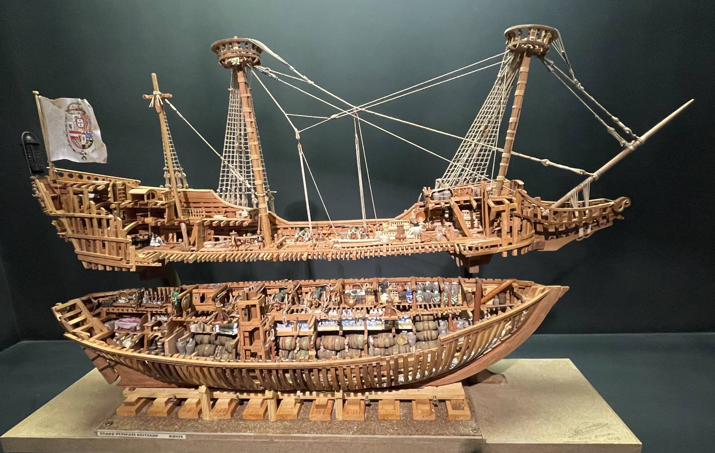 | Description | Modelo a escala del galeón “San Diego” una de las embarcaciones que formaron parte de los llamados Galeón de Manila, que designaban a aquellos buques que durante 250 años (1565-1815) hicieron la ruta Acapulco-Manila-Acapulco. Este modelo está construido seccionado longitudinalmente y enramada lo que hace que pueda verse el tipo de cargamento y la disposición del mismo abordo. El galeón original fue construido en Cebú (Filipinas) y, según sus restos arqueológicos, siguiendo los patrones constructivos de los astilleros vascos. Se hundió el 14 de diciembre de 1600 en la Bahía de Manila tras un combate contra corsarios neerlandeses del que salió victorioso pero muy dañado, naufragando a las horas con toda su carga, armamento, etc. |
